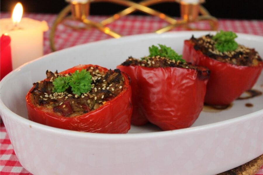 Hvad med en lækker fyldt rød peberfrugt til middagen? Peberfrugterne er helt uden nogen former for korn, og så kan den laves fedtfri hvis det…