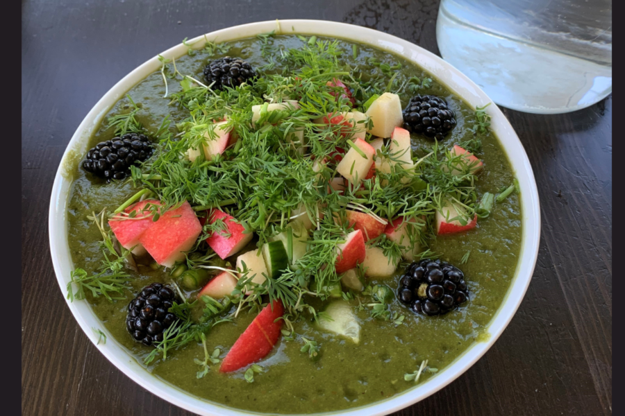 Kold tomat/spinat suppe med agurkenudler