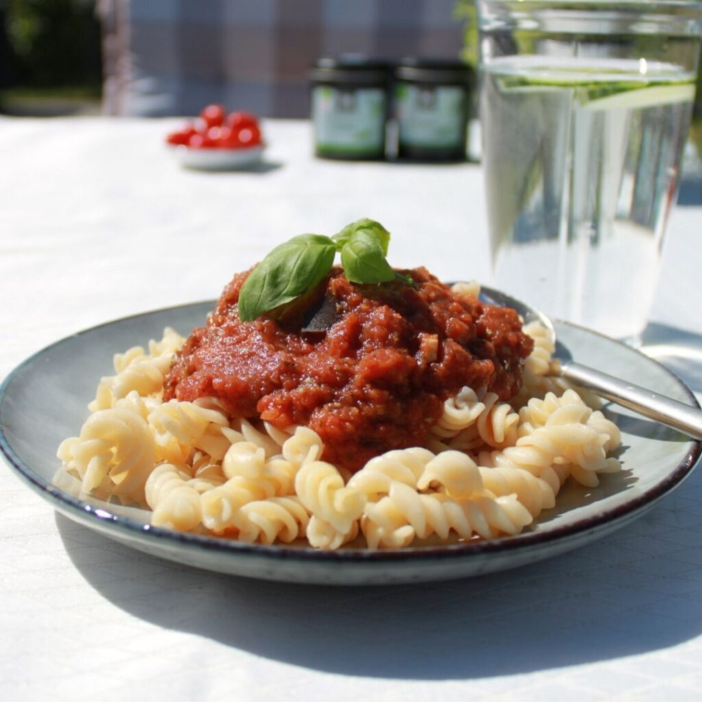 Pasta bolognese, bedre kendt som pasta kødsovs, er nok en klassiker i det fleste børnefamilier, og denne udgave smager skønt og meget lig den oprindelige med kød i. Der er selvfølgelig forskel i teksturen, da kød er sejere at tygge i, men som mine børn siger, kan de slet ikke smage om der er kød i eller ej.