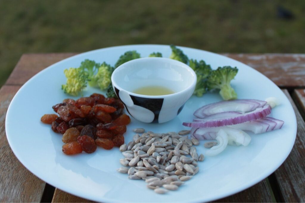 Vask og tør broccolien og skær den i små buketter. Hak rødløget i små tern. Læg broccoli, rødløg, solsikkekerner og rosiner i en skål.
