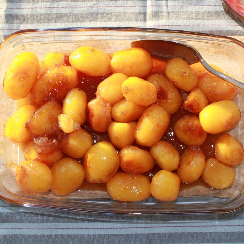 Jeg kan aldrig lave nok brune kartofler til min familie. Jeg skrællede her 30 kartofler og tænkte at det måtte være nok med 6 kartofler pr. person. Alle fik hvad de havde behov for, men hvis mine unger havde fået lov at bestemme, havde de nok bestilt dobbelt så mange, og spist sig mætte i brune kartofler alene.