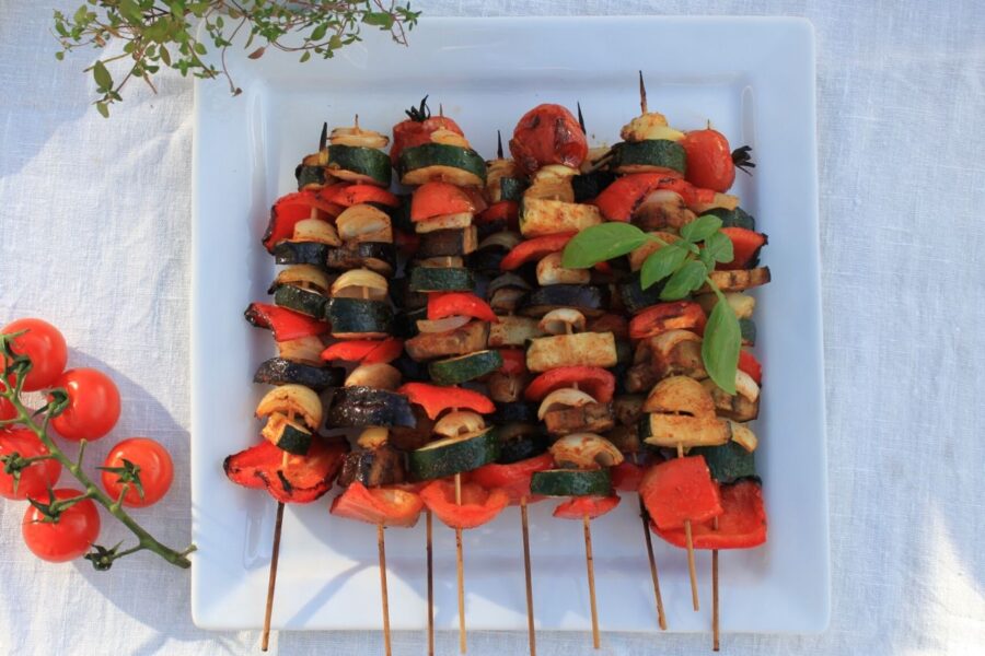 Disse grillspyd er lavet med peberfrugt, løg, squash, aubergine og tomater, og er krydret med en god paprika- og muskatnødsmarinade. Nogle gange bruger vi grillspyd…
