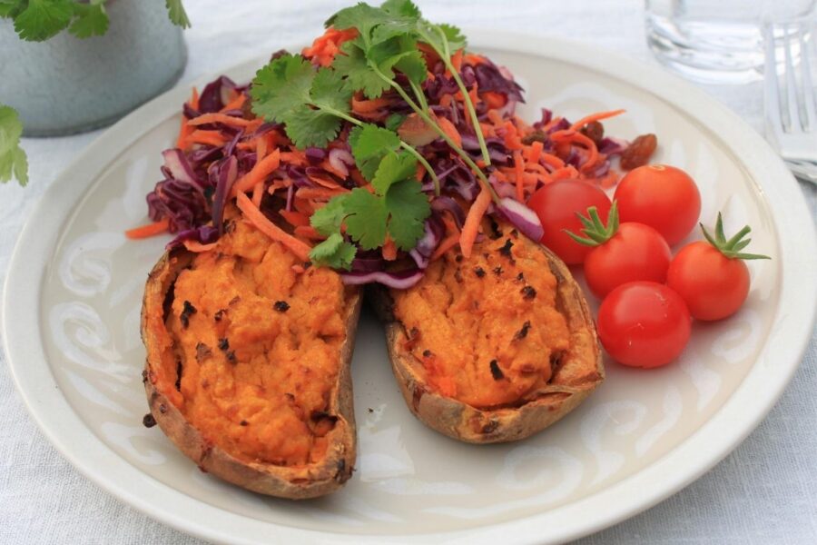 Fyldte søde kartofler med kikærter og råkostsalat