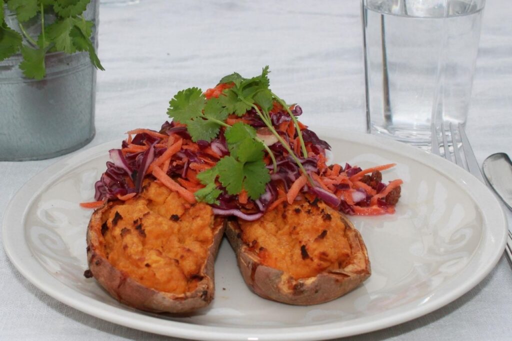 Fyldte søde kartofler med kikærter og råkostsalat