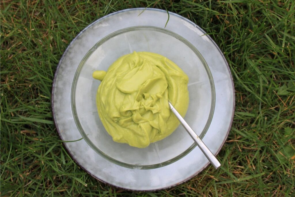 Halver avokadoerne, fjern stenen og brug en ske til at skubbe kødet ud i en skål. Pres et fed hvidløg ned i og blend med stavblender et par minutter ind til cremen er helt glat.
