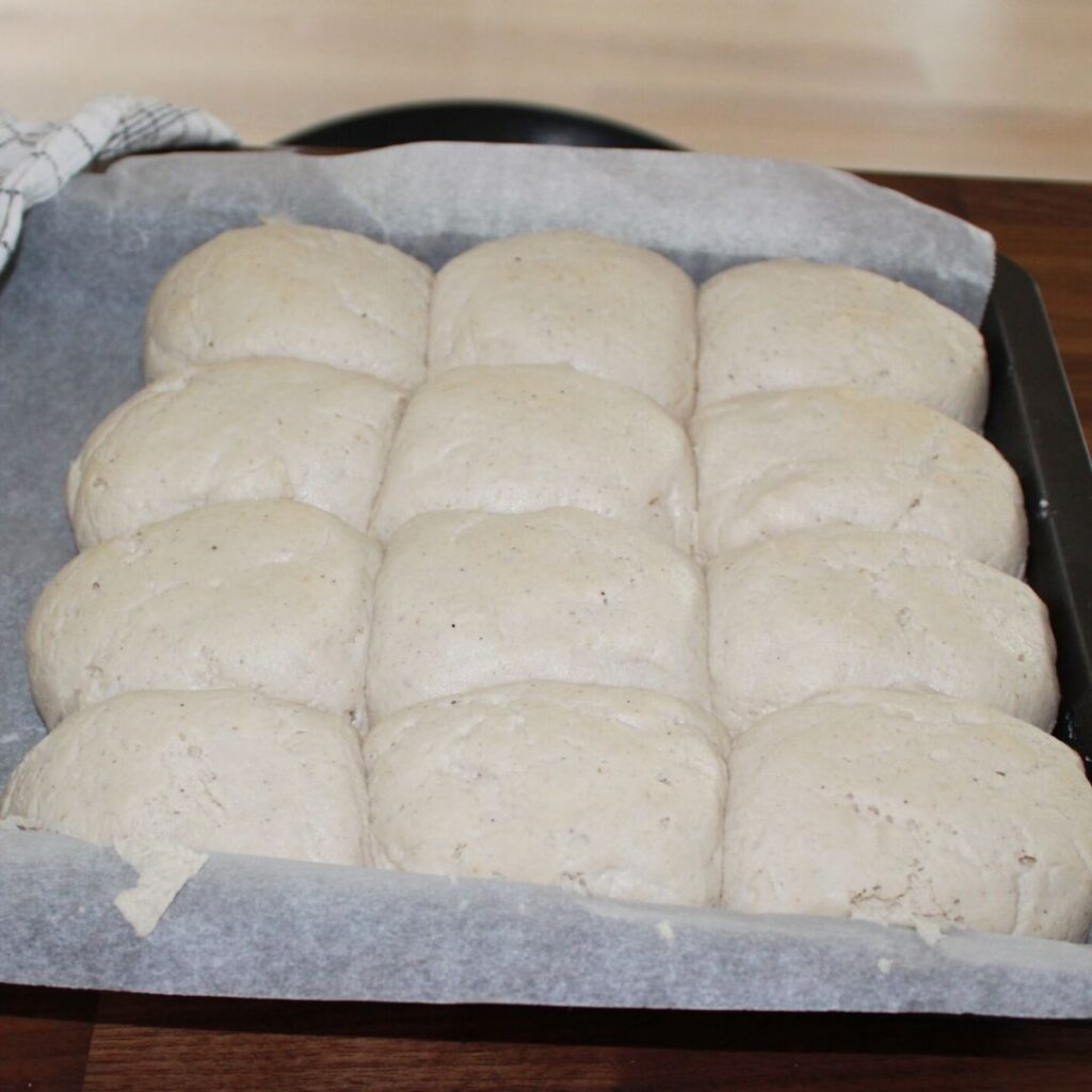 Tag en mindre bradepande eller firkantet kageform. Beklæd den med bagepapir og form ca. 12 boller. Sæt bollerne så de lige akkurat rører hinanden. Bollerne skal nu hæve 1 – 1½ time med viskestykke over. De vokser ikke til dobbeltstørrelse, som glutenboller gør, men de hæver alligevel godt sammen.