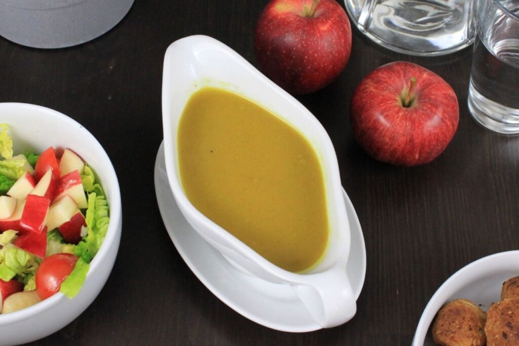 Blend sovsen igennem med en stavblender, så de små løg og æblestykker forsvinder. Smag sovsen til med honning eller ananassaft og en smule salt.