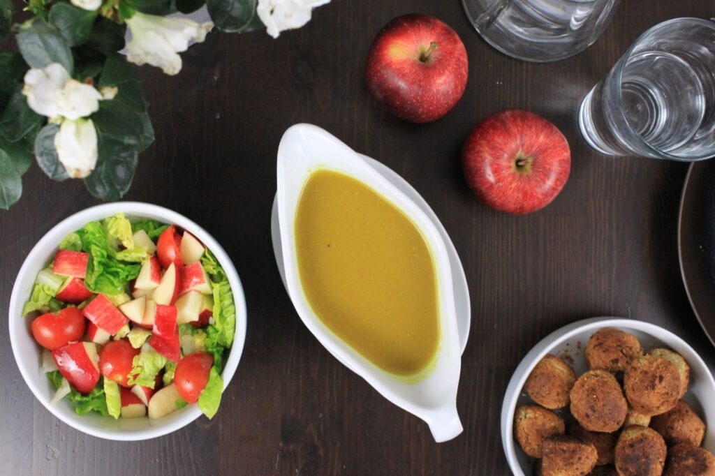 Hvis der bruges cashewmælk, hældes først kogende vand over cashewnødderne, så det kan blive bløde. (Alternativt kan der bruges kokosmælk). Cashewnødderne skal trække minimum 10 min. Lun bouillonen i en gryde. Skræl og riv æblet. Hak løgene fint. Svits løg og æble i kokosolie eller evt. lidt vand, indtil løgene er bløde. Tilsæt karry og svits et minutstid. Tilsæt evt. en skefuld bouillon eller to, så karryen ikke brænder på. Tilsæt nu al bouillonen og lad sovsen koge op. Den skal småkoge ca. 10 -15 min. og gerne længere.