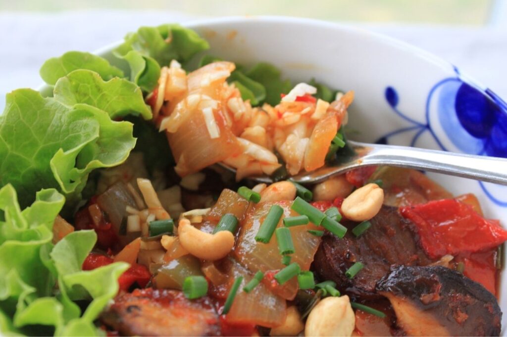 Kung Pao grøntsager med kejserhatte og hvidkålsris