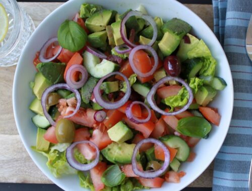 Salaten på billedet er fedtfri, fordi jeg serverede den til frokost, men man kan sagtens tilføje lidt avokado strimler og ristede sesam og få lidt sund fedt oveni. Dryp evt. også lidt kokosaminos på, for at få lidt saltsmag.