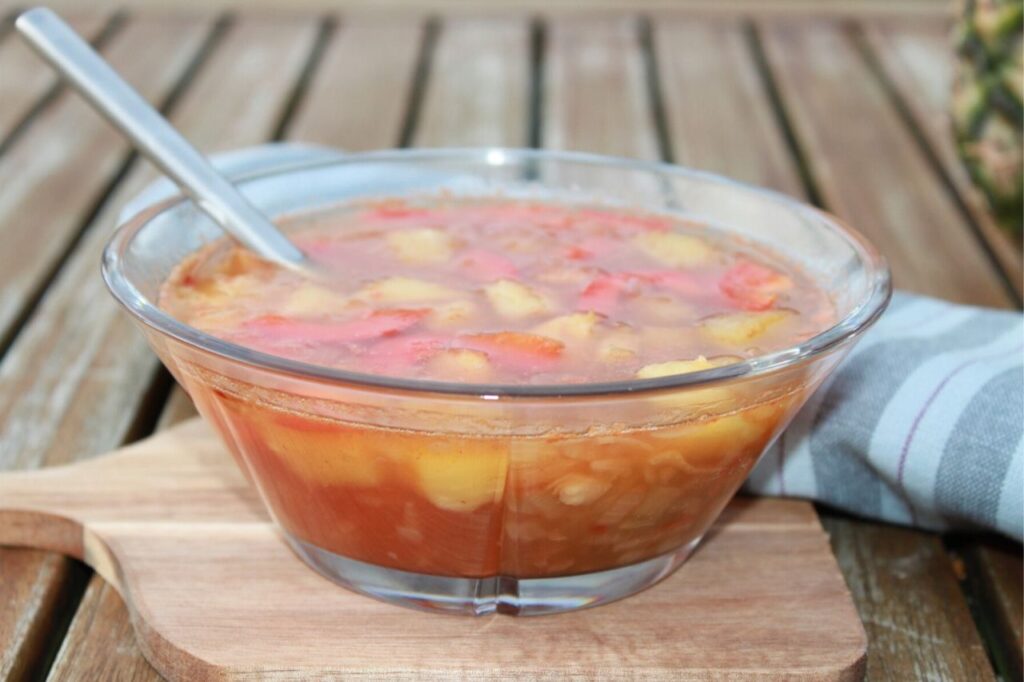 Skær løg i tern. Varm løgene i en gryde med lidt vand i bunden så de ikke brænder på. Når løgene er blanke, hældes ananassaft, citronsaft, resten af vandet og ahornsirup i gryden. Lad det koge op. Tilsæt tomatkoncentrat og chiliflager, og smag til med cocosaminos og salt.