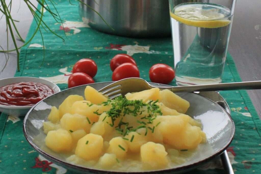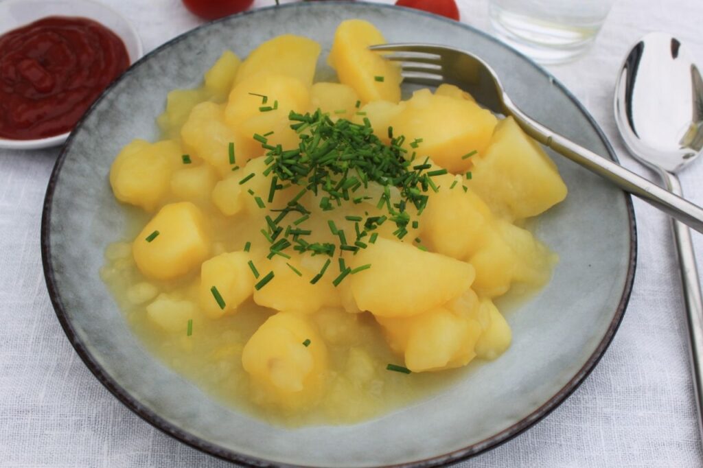 Tag nu 1/3 dele af kartoflerne fra og læg i en skål ved siden af. Tilsæt den anden 2/3 del af kartoflerne samt kogevand, så det dækker kartoflerne og kog op mens der røres i gryden. Rør forsigtigt i 5 minutters tid mens kartoflerne koger videre. De begynder nu at blive let mosede og kogevandet bliver til en tykkere suppe. Alle kartoflerne skal ikke moses så rør stille og roligt. Når vandet er godt tykt, slukkes for varmen og resten af kartoflerne hældes i. Retten kan nu serveres med et drys purløg og ketchup til.