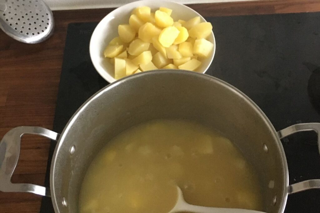 Skræl og skær kartoflerne i store tern. Læg dem i en gryde og hæld vand over så det lige akkurat dækker kartoflerne. Hæld salt ved og kog kartoflerne ca 15 min. så de er møre, men ikke falder fra hinanden. Hæld kogevandet i en skål eller kande. Det skal bruges til retten.